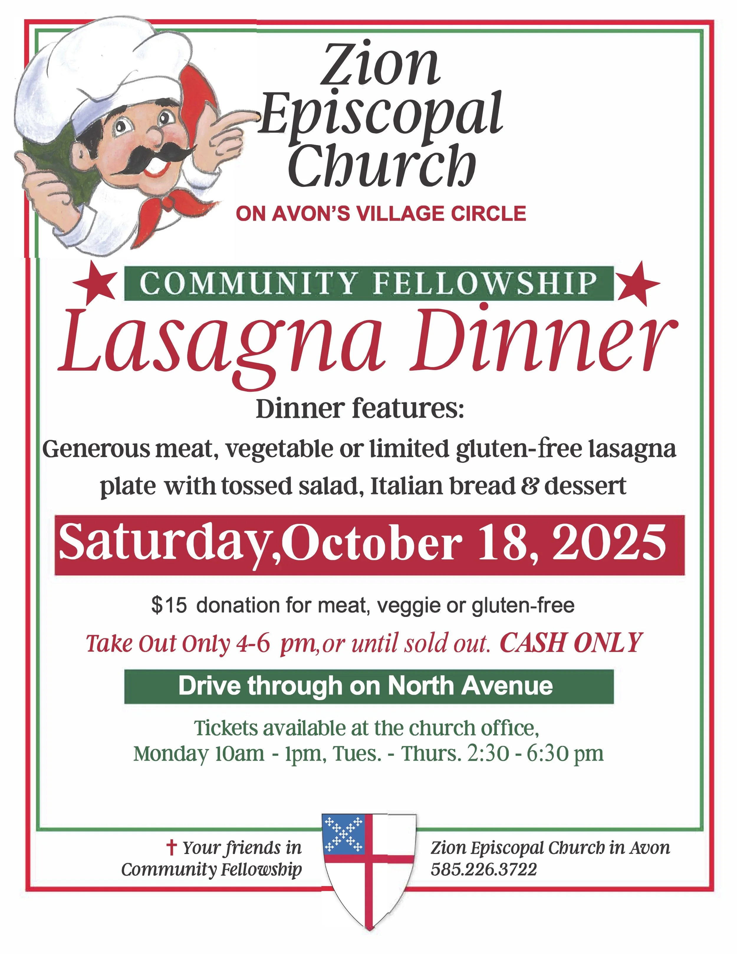 Join us for our annual Fall Lasagna Dinner with our famous homemade recipes for three delicious flavors - meat, veggie and gluten-free. All donations support the mission of Zion.